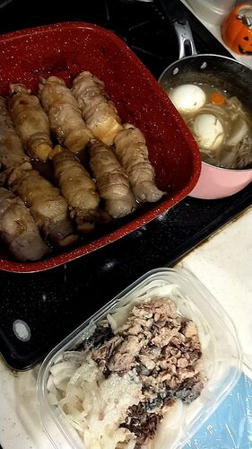 にかえ色目悪いんが、スラタマ鯖缶プレーンちょいオリーブオイル。昆布茶塩麹ちょいビミサンで炊いた高野豆腐を汁斬って、大葉豚薄切り肉で巻いたのを焼いて、ポン酢主体で煮る。斬った汁は大根榎木茹で卵で薄味煮物。 こんな健康食、やだ、と画像/キャプシ…